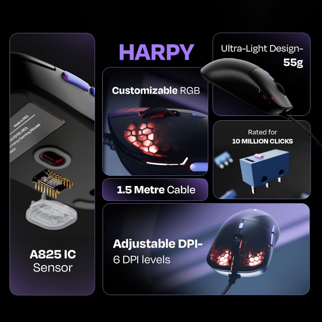Kreo Harpy Wired Gaming Mouse 55g Ultra-Light Gaming Mouse | 12,800 DPI | 1000Hz Polling Rate | Customizable RGB (13 Modes)